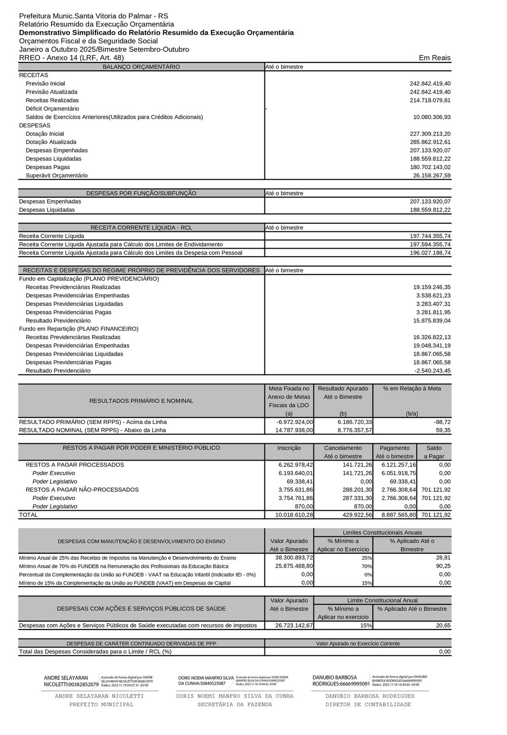 Demonstrativo Simplificado do Relatório Resumido da Execução Orçamentária - Orçamentos Fiscal e da Seguridade Social Janeiro a Outubro 2025/Bimestre Setembro-Outubro