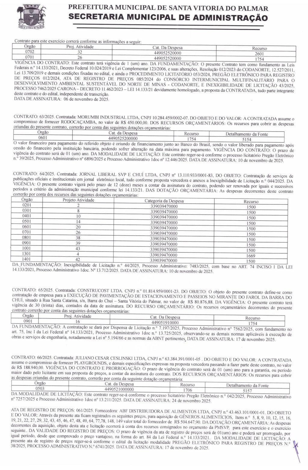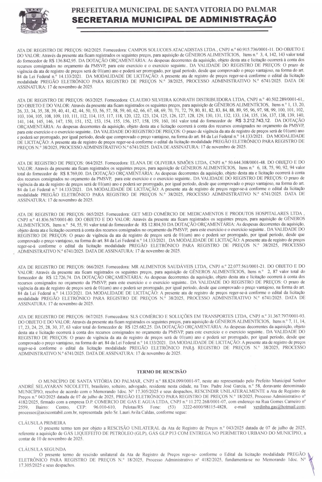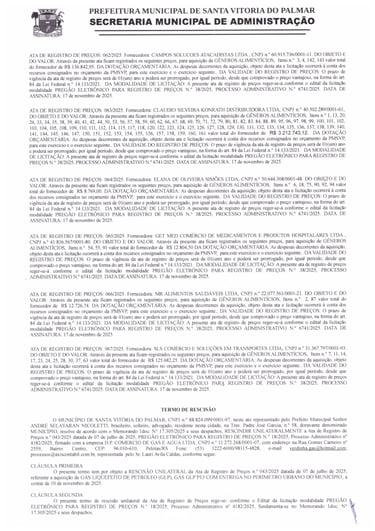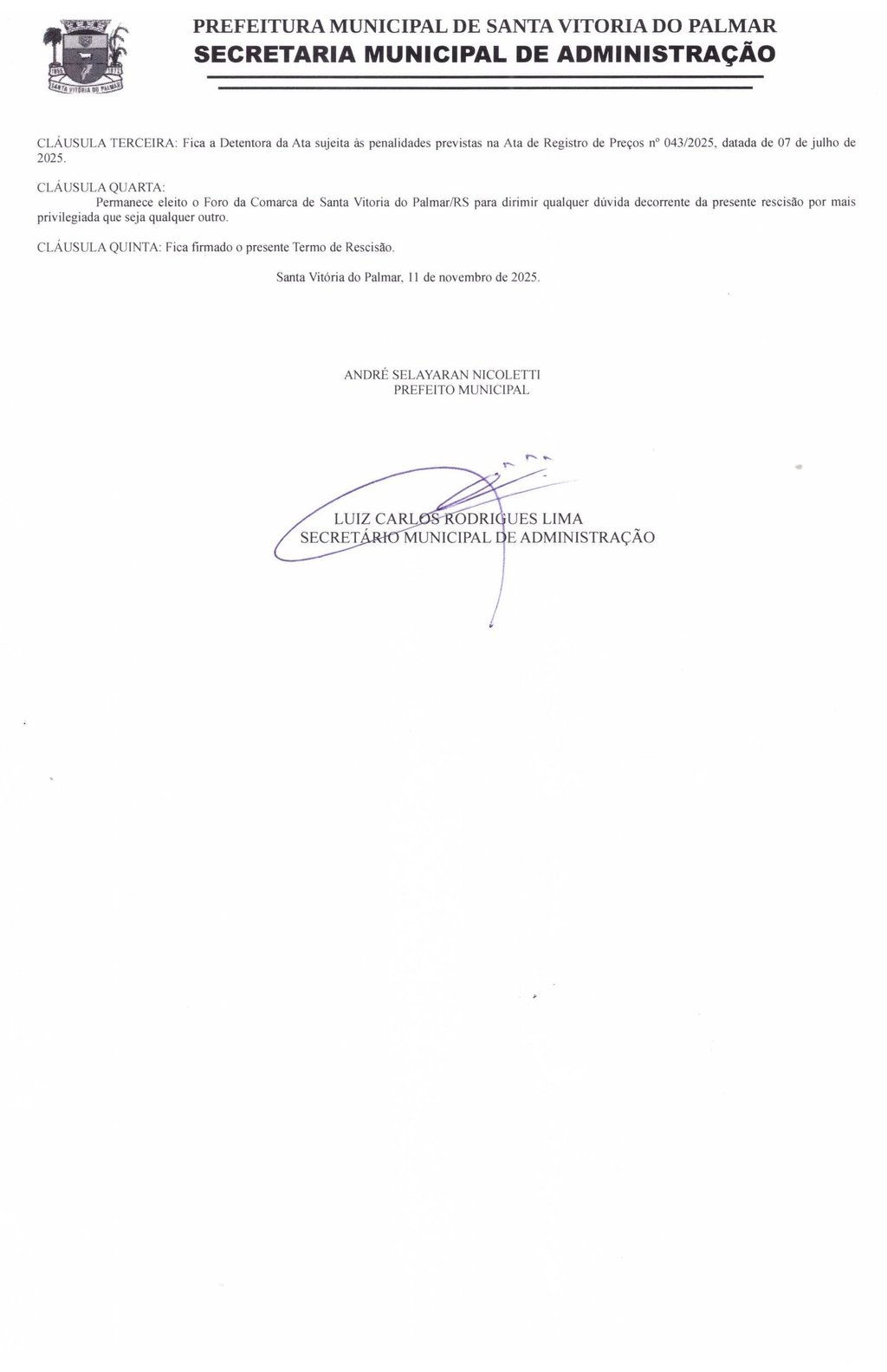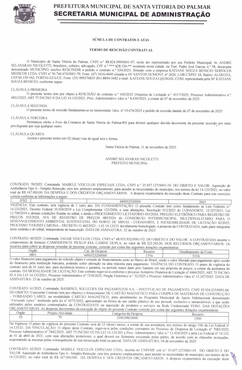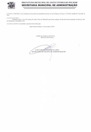 O Município de Santa Vitória do Palmar, CNPJ n.° 88.824.099/0001-97, neste ato representado por seu Prefeito Municipal, Sr. ANDRÉ SELAYARAN NICOLETTI, brasileiro, solteiro, advogado, CPF n.° ***828.520-** residente nesta cidade, na Trav. Padre José Garcia, n.º 58, doravante denominado MUNICÍPIO, resolve RESCINDIR a pedido o contrato n.° 030/2025.