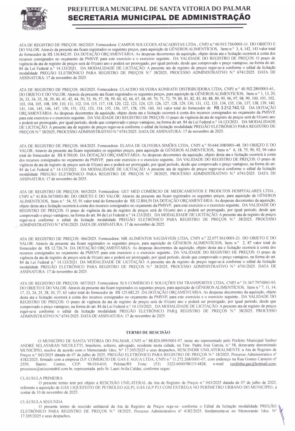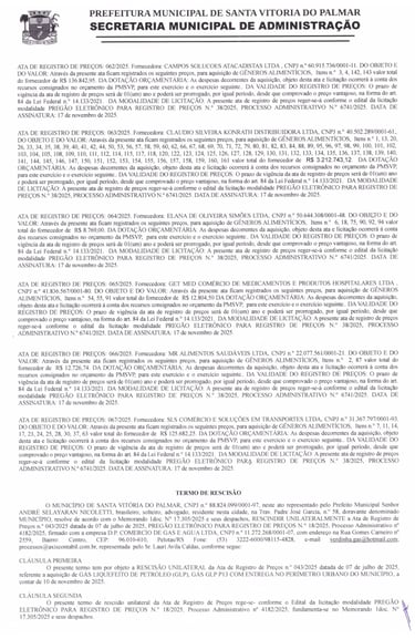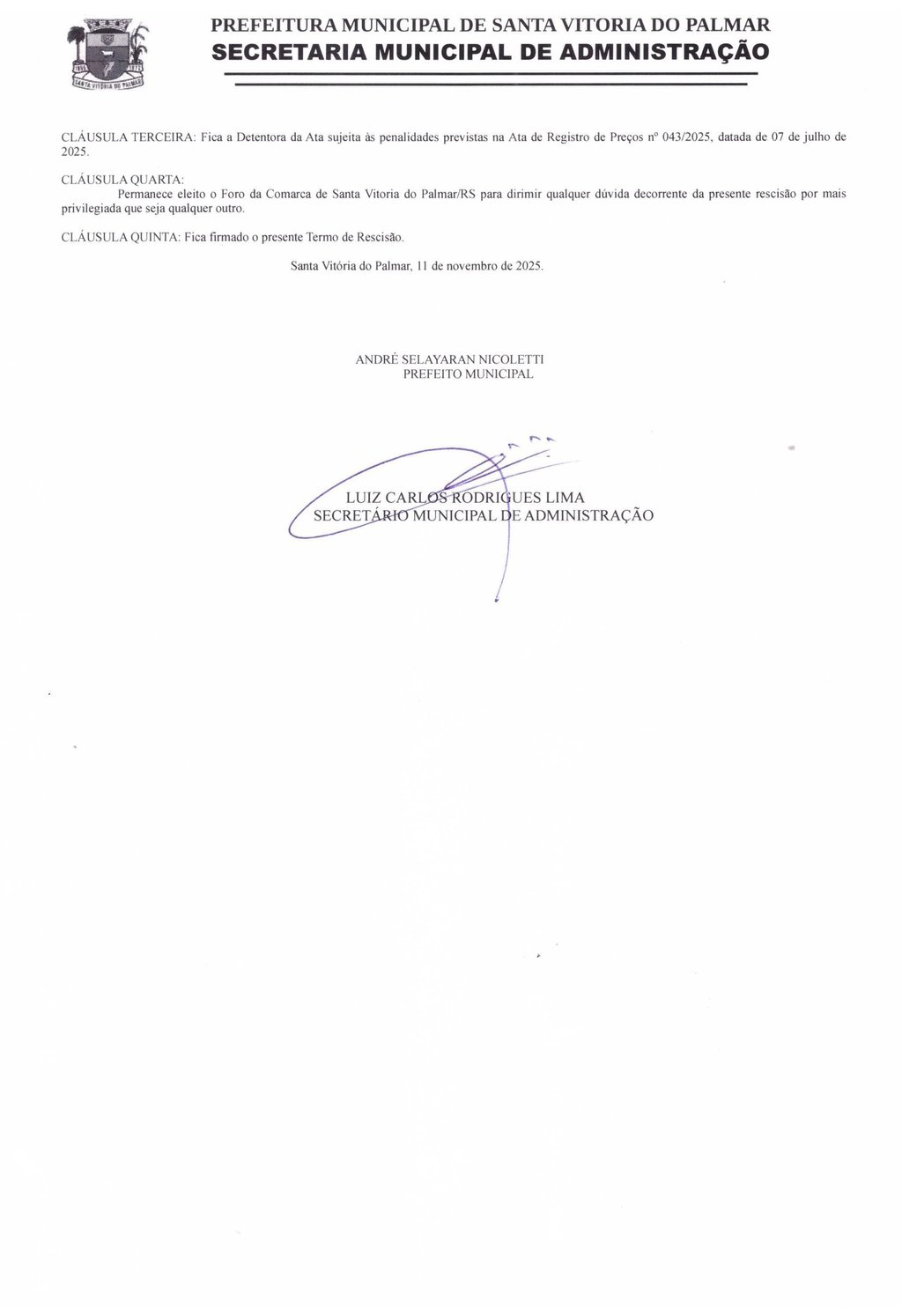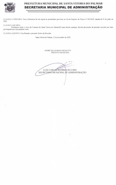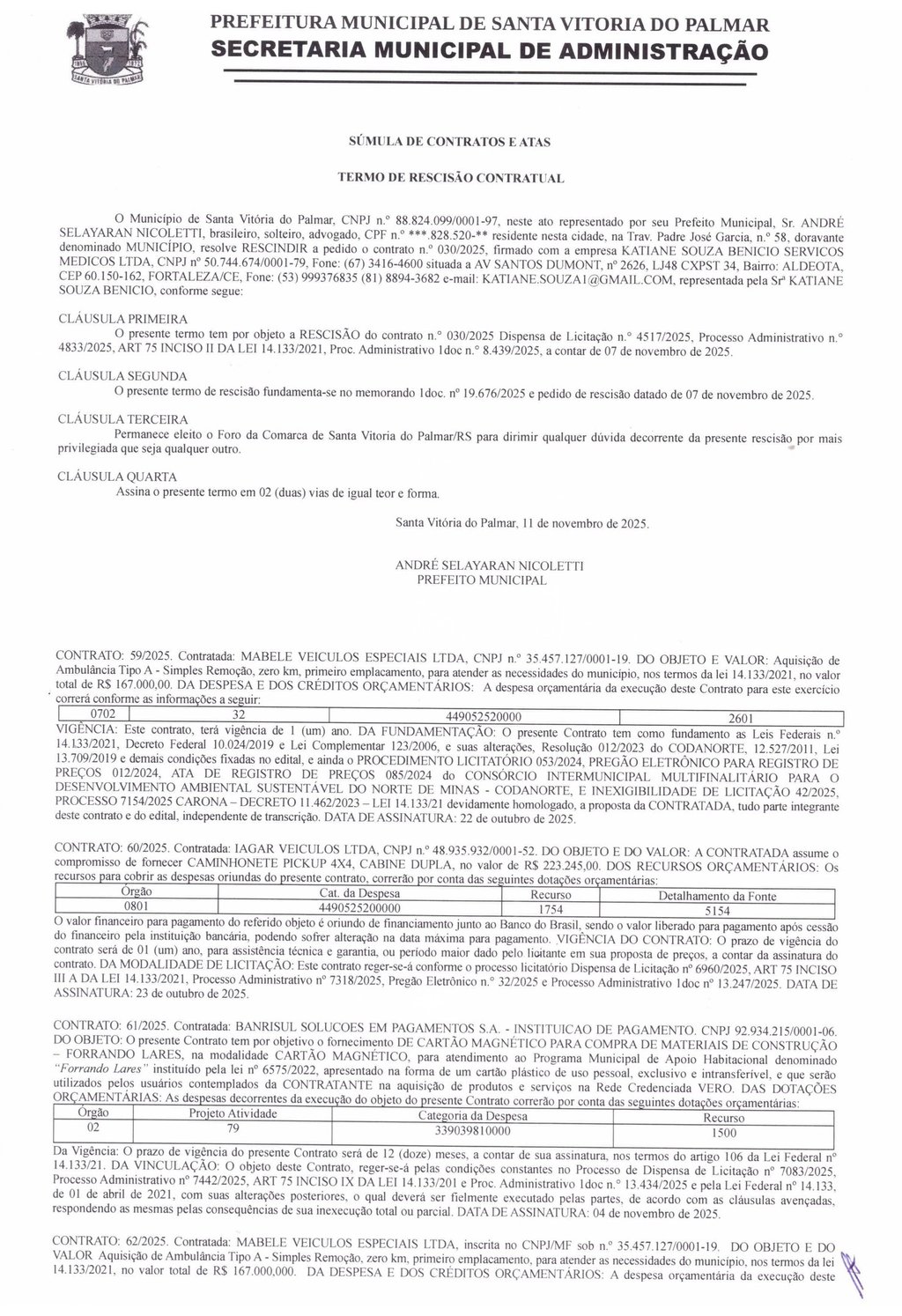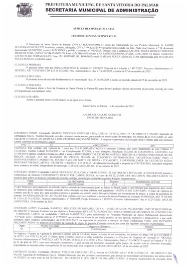 O Município de Santa Vitória do Palmar, CNPJ n.° 88.824.099/0001-97, neste ato representado por seu Prefeito Municipal, Sr. ANDRÉ SELAYARAN NICOLETTI, brasileiro, solteiro, advogado, CPF n.° ***828.520-** residente nesta cidade, na Trav. Padre José Garcia, n.º 58, doravante denominado MUNICÍPIO, resolve RESCINDIR a pedido o contrato n.° 030/2025, firmado com a empresa KATIANE SOUZA BENICIO SERVICOS MEDICOS LTDA, CNPJ n° 50.744.674/0001-79, Fone: (67) 3416-4600 situada a AV SANTOS DUMONT, nº 2626, LJ48 CXPST 34, Bairro: ALDEOTА. CEP 60.150-162, FORTALEZA/CE, Fone: (53) 999376835 (81) 8894-3682 e-mail: KATIANE.SOUZA1@GMAIL.COM, representada pela Sr KATIANE SOUZA BENICIO, conforme segue: