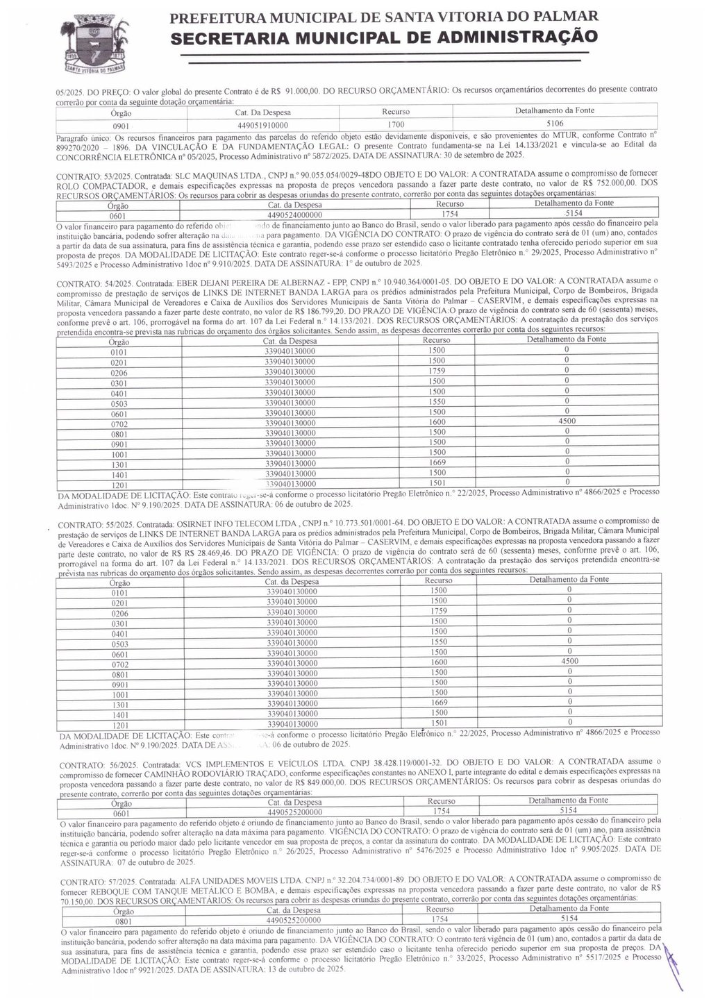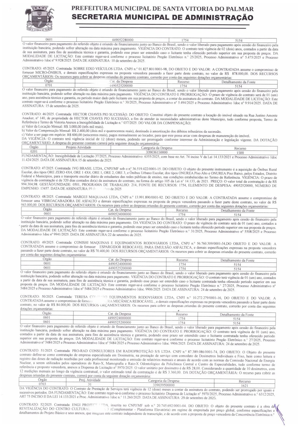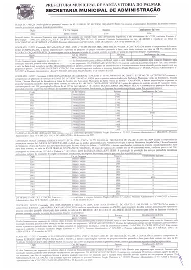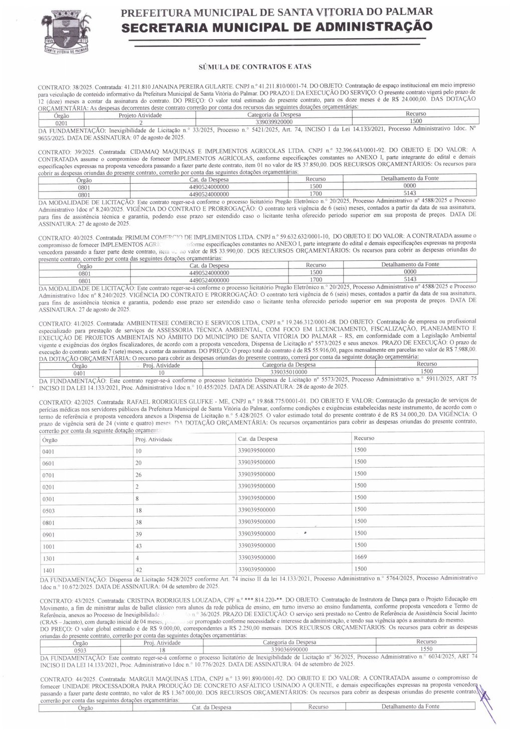 A Prefeitura Municipal de Santa Vitória do Palmar, por meio da Secretaria Municipal de Administração, divulgou a nova súmula de contratos e atas oficiais. As publicações reúnem registros recentes de contratações, serviços e licitações realizadas pelo Executivo Municipal, contemplando desde assessoria técnica e comunicação institucional até fornecimento de materiais e execução de projetos específicos. A medida reforça a transparência administrativa e a regularidade dos processos de gestão pública no município.