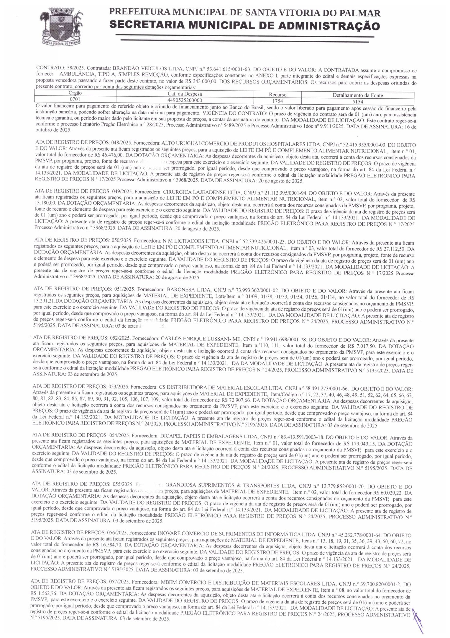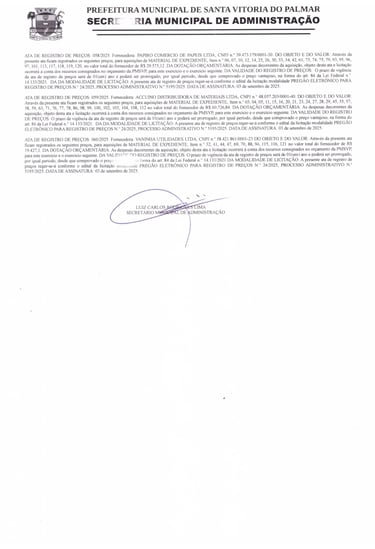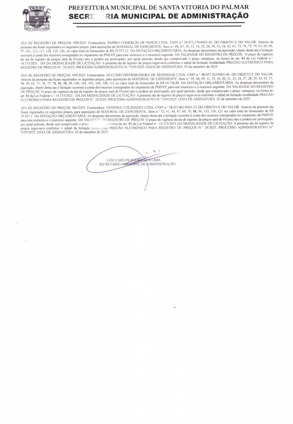 A Prefeitura Municipal de Santa Vitória do Palmar, por meio da Secretaria Municipal de Administração, divulgou a nova súmula de contratos e atas oficiais. As publicações reúnem registros recentes de contratações, serviços e licitações realizadas pelo Executivo Municipal, contemplando desde assessoria técnica e comunicação institucional até fornecimento de materiais e execução de projetos específicos. A medida reforça a transparência administrativa e a regularidade dos processos de gestão pública no município.