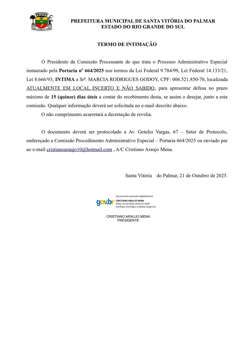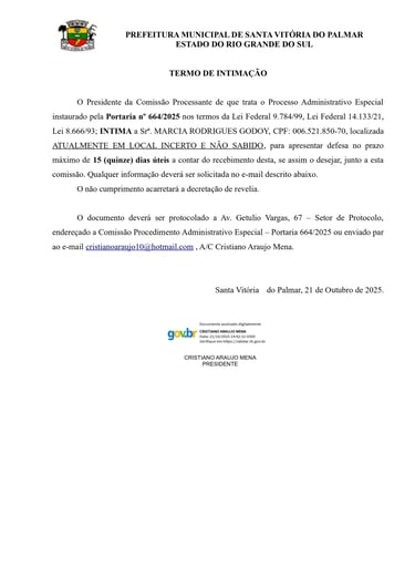 O Presidente da Comissão Processante de que trata o Processo Administrativo Especial instaurado pela Portaria nº 664/2025 nos termos da Lei Federal 9.784/99, Lei Federal 14.133/21, Lei 8.666/93; INTIMA a Srª. MARCIA RODRIGUES GODOY, CPF: 006.521.850-70,